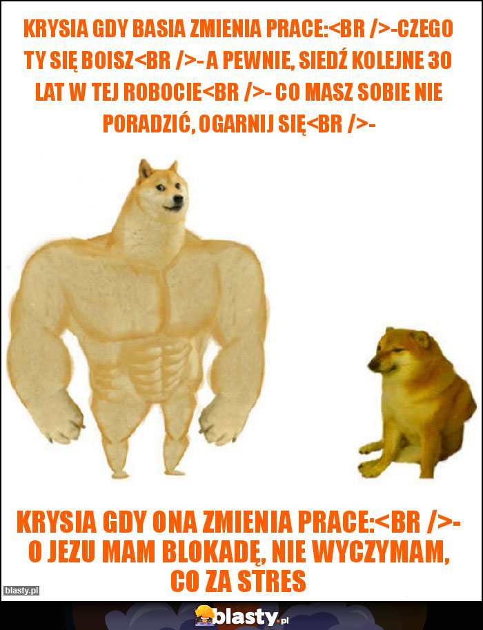 Krysia gdy Basia zmienia prace: -czego ty się boisz - a pewnie, siedź kolejne 30 lat w tej robocie - co masz sobie nie poradzić, ogarnij się -