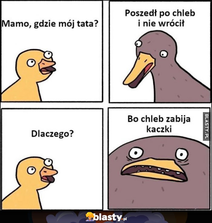 Mamo, gdzie mój tata? Poszedł po chleb i nie wrócił, dlaczego? Bo chleb zabija kaczki komiks
